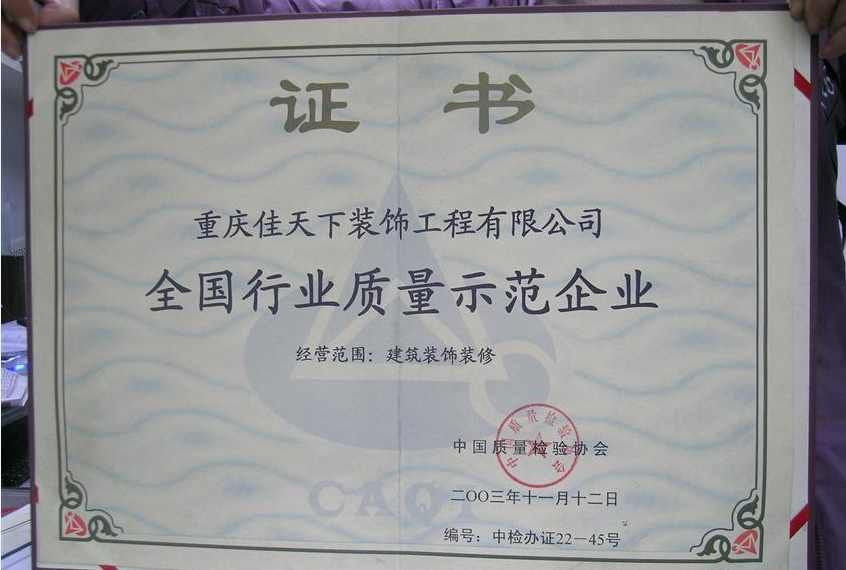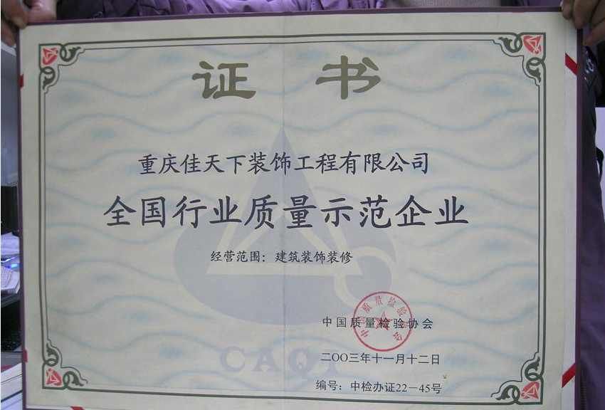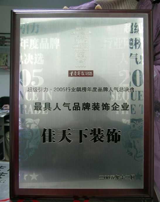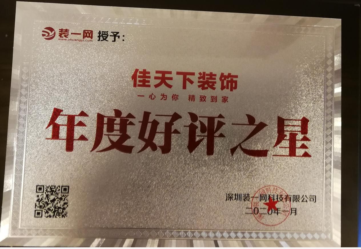跬步千里,小流江海。在“誠信、進取、合作、創(chuàng)新”的企業(yè)理念基礎上,在“一心為你,精致到家”的企業(yè)信念下,佳天下裝飾先后獲得:全國行業(yè)質(zhì)量示范企業(yè)、重慶整裝協(xié)會會長單位、重慶市消費者信得過企業(yè)、重慶市建筑裝飾協(xié)會會員單位等80余項榮譽。