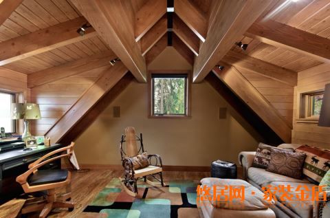 這個客廳閣樓裝修沒有改變閣樓的固有形態(tài),里面的裝修設計、家具布置也都是完全按照閣樓的走向來的。從閣樓客廳裝修效果圖來看,這個客廳裝修風格時非常貼近大自然的時尚田園風,用料多為原木,為了達到放松的目的,沙發(fā)、搖椅都非常地貼合人體的設計,而顏色獨特的地毯也與這些家具渾然一體。這個客廳閣樓裝修最大的與眾不同之處在于設計師充分利用了閣樓特有的私密性,在將它設計成客廳的時候還裝修成了書房。而閣樓三面均有的大小不易的窗戶保證了它的采光與通風。