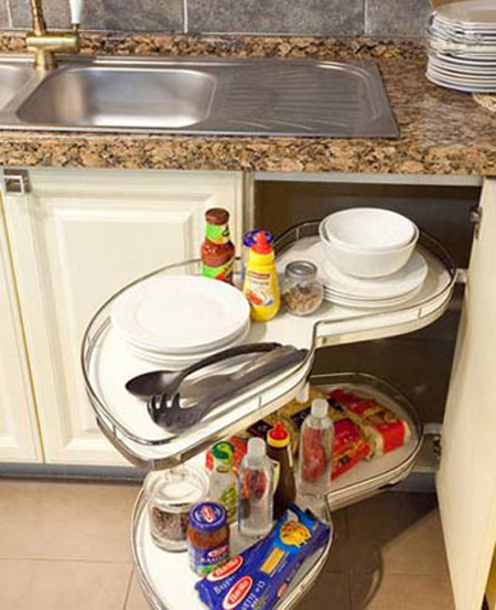 CASE4:轉(zhuǎn)角空間利用,櫥柜中的多層設(shè)計(jì)可以方便常用物品的收納,這樣的轉(zhuǎn)角層架,能很好地利用轉(zhuǎn)角空間,轉(zhuǎn)盤(pán)式設(shè)計(jì)也方便使用,L型、U型櫥柜都可以考慮有這樣的一個(gè)層架哦。