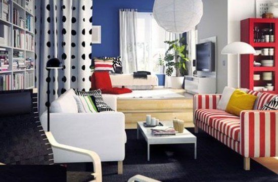 客廳包含視聽區(qū)和會(huì)客區(qū)兩部分??蓯鄣牟c(diǎn)出現(xiàn)在黑白色的窗簾上,以軟性屏風(fēng)的形式分割區(qū)間。整個(gè)客廳裝飾采用一點(diǎn)幾何圖形和亮麗的色彩,演繹出最潮的輕波普風(fēng)。
