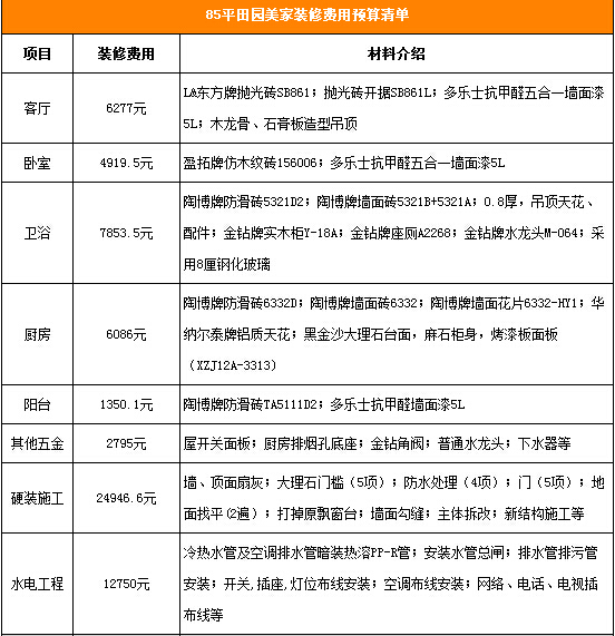 這個85平米的案例是由裝修公司全包完成的,完成整個裝修費用約為6.7萬。其中包括硬裝施工,以及所有的主要建材,家電、家具等都由戶主自己出錢購買。