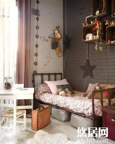 LOFT的這個(gè)兒童房是不是很粗獷?你看這個(gè)裸裝的墻面,你看這個(gè)鐵藝的床架,你看這個(gè)古舊的收納盒,整個(gè)空間充滿了個(gè)性元素。而布置在空間里的長(zhǎng)頸鹿飾品,小熊布玩偶等,仿佛置身于極具自然氣息的野外,讓孩子與自然無(wú)界。