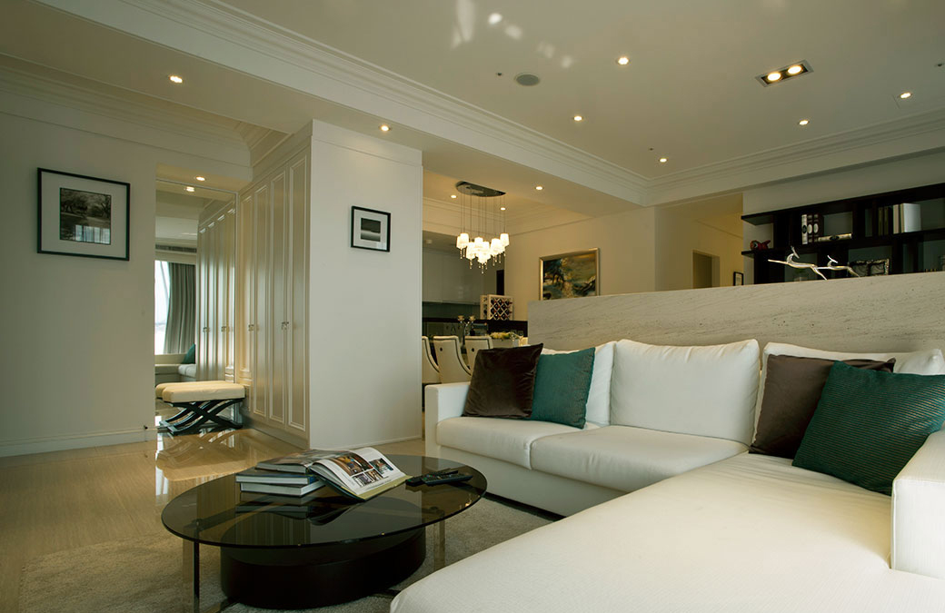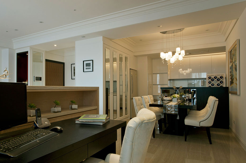 雙面柜施以線板造型,呼應整體的新古典表現。