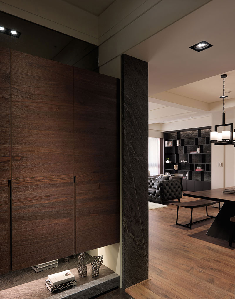 一般在規(guī)劃隔間時,若只是多加一道墻劃分,不免有些可惜。因此,設計師建議在場域與場域間,若有隔間需求時,可以透過雙面柜的概念,達到機能界定與收納加倍的兩種效果。而在設計表現上,也能針對整體的風格設定,運用一些造型語匯,讓柜體無違和地融入空間中。