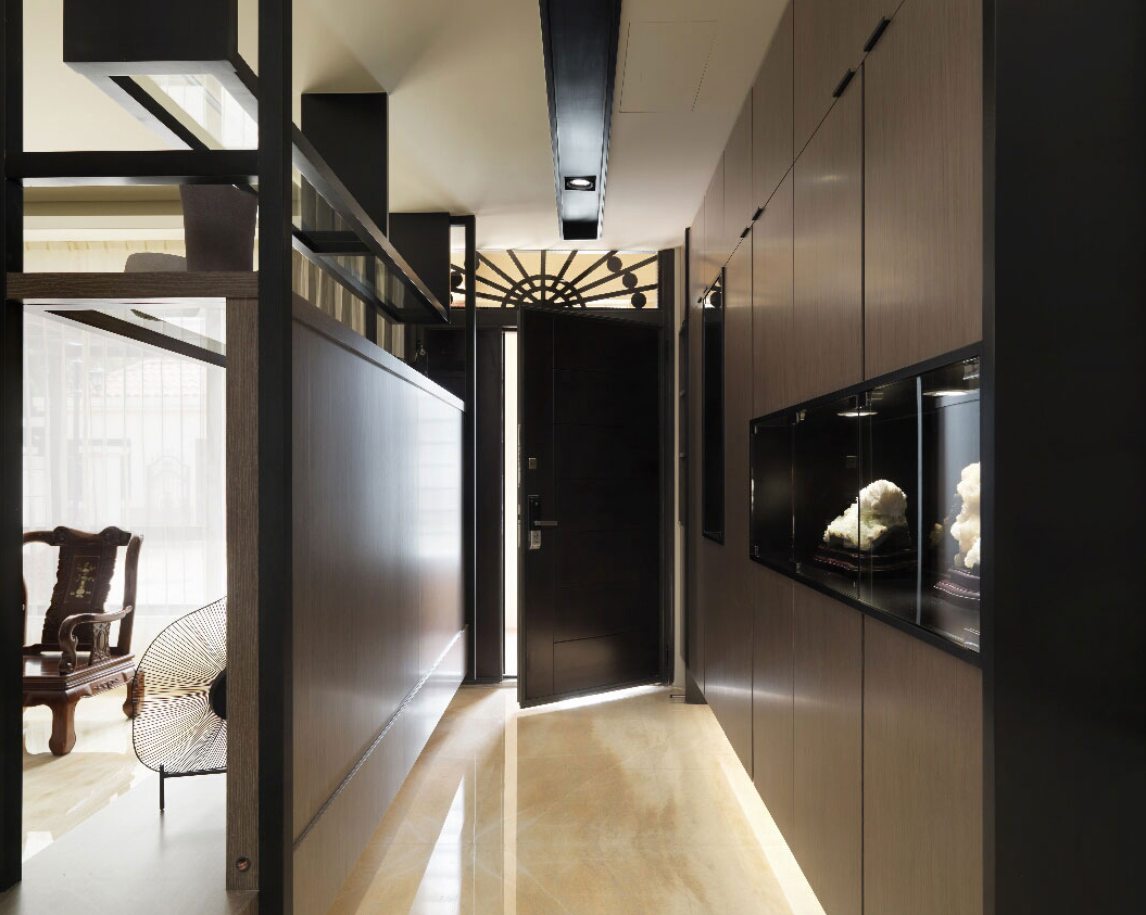 玄關與餐廚間,設置一道雙面柜,滿足場域界定與收納的需求。