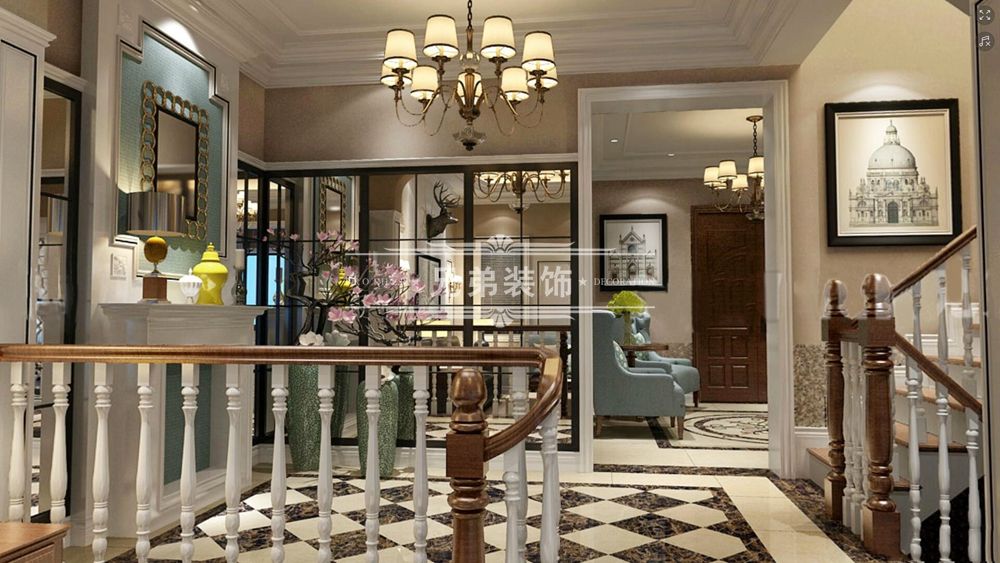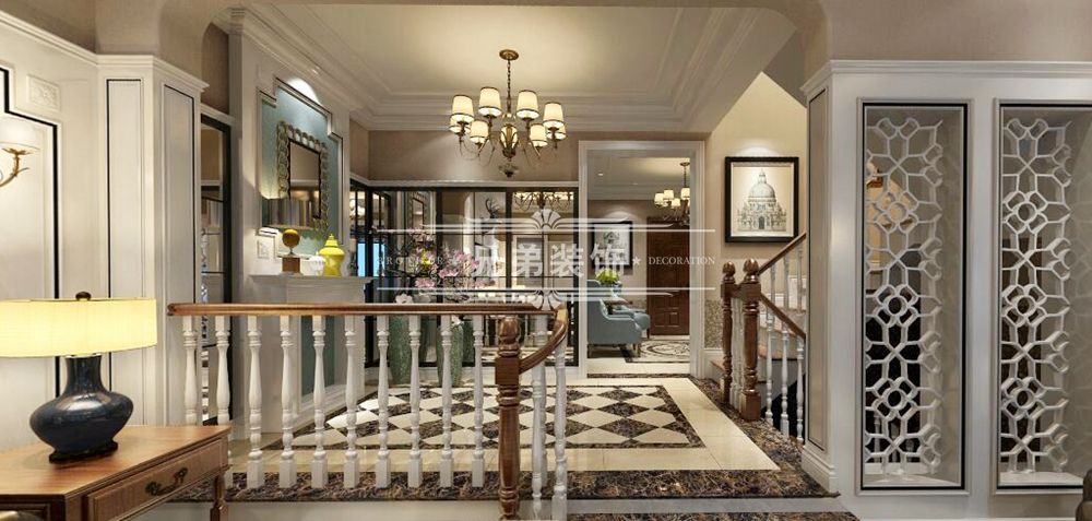 3、客廳與樓梯間則用半隔斷雕花處理,讓身處客廳的人可以一覽客廳與樓梯的通透空間,使得視野得到了最大限度的擴張