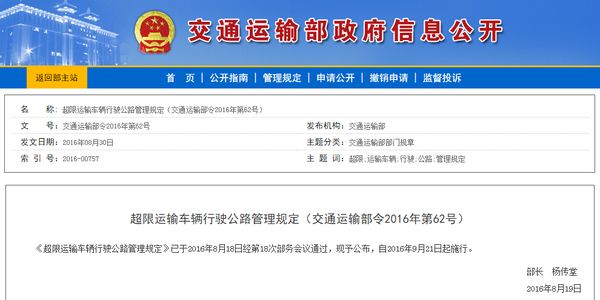 2016年9月21日,《超限運輸車輛行駛公路管理規(guī)定》正式實行,并規(guī)定有以下情形之一的貨運車輛即為超限運輸車輛。