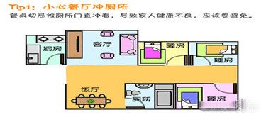 餐桌切忌被廁所門(mén)直沖。餐桌是家人進(jìn)食的口福之處,而廁所是“出穢”的不潔之地,彼此直對(duì)當(dāng)然不吉,容易“病從口入”,導(dǎo)致家人健康不良,所以應(yīng)該要避免。