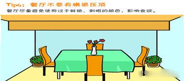 餐桌上方宜平忌壓。若上方屋頂傾斜不平或橫梁壓頂,或位于樓梯底下,均會(huì)對(duì)家人健康有損,必須設(shè)法避免. 橫梁成煞,幾乎略懂風(fēng)水的人都知道。但橫梁所壓者不同,便有不同的影響,如飯桌上方有橫梁,便做成橫梁壓飯桌了。這會(huì)妨礙人的消化能力,久而久之,便招致腸胃病了。