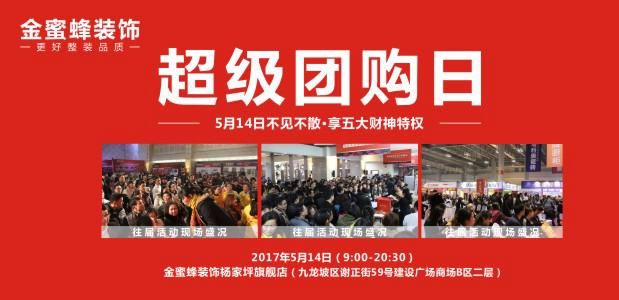 超級(jí)團(tuán)購日 時(shí)間:2017年5月14日(9:00-----20:30) 地點(diǎn):金蜜蜂裝飾楊家坪店(九龍坡區(qū)謝家灣正街59號(hào)建設(shè)廣場(chǎng)B棟)