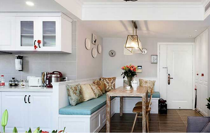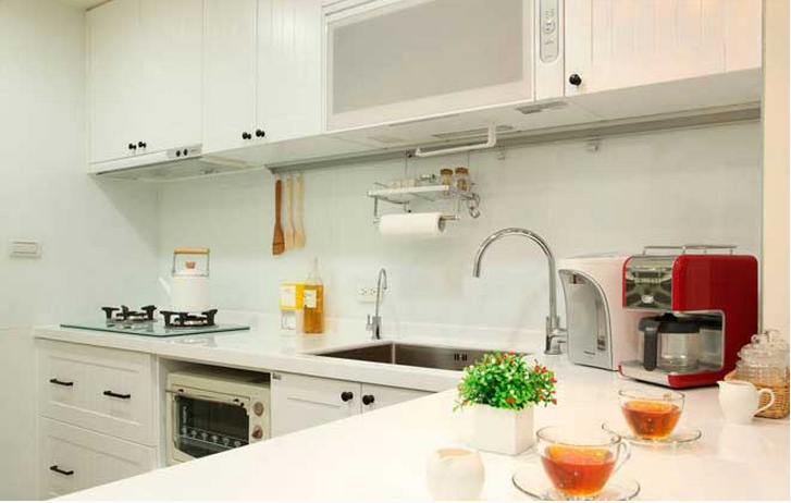 構(gòu)筑一處以白色為基底的幸福居宅,并注入清新感的鄉(xiāng)村風(fēng)語(yǔ)匯,讓滿室呈現(xiàn)舒緩的空間暖意。在僅有56平的小小天地中,保留最大的空間給最愛(ài)的家人,除了將客、餐廳連貫,增加小孩的游戲空間,并將原有的廚房隔間打掉,以開(kāi)放式、中島吧臺(tái)的餐廚空間來(lái)表現(xiàn)。