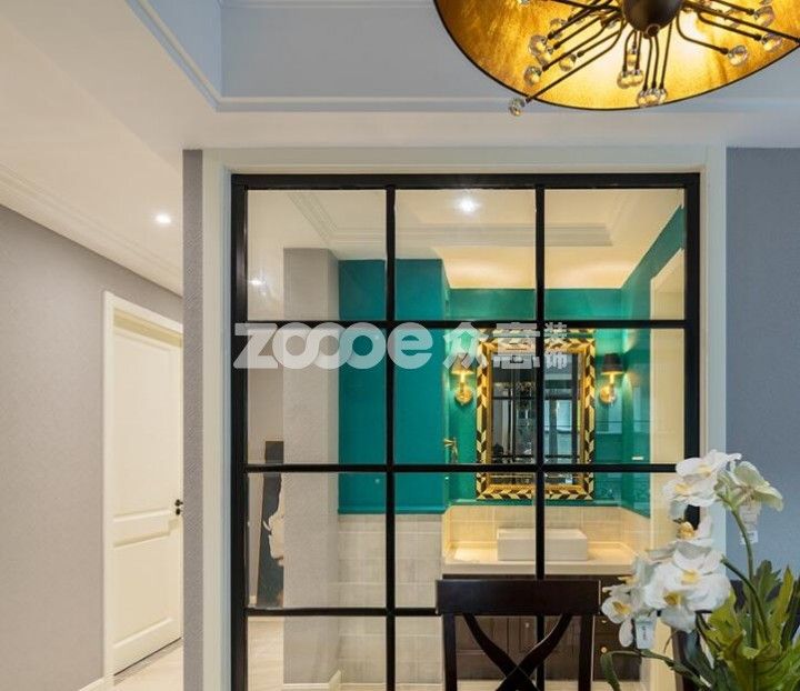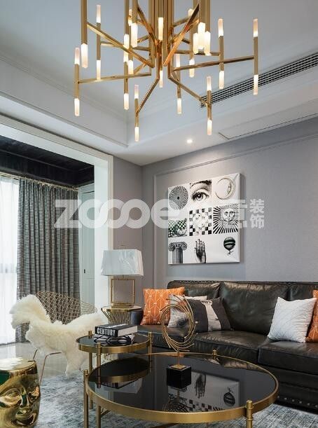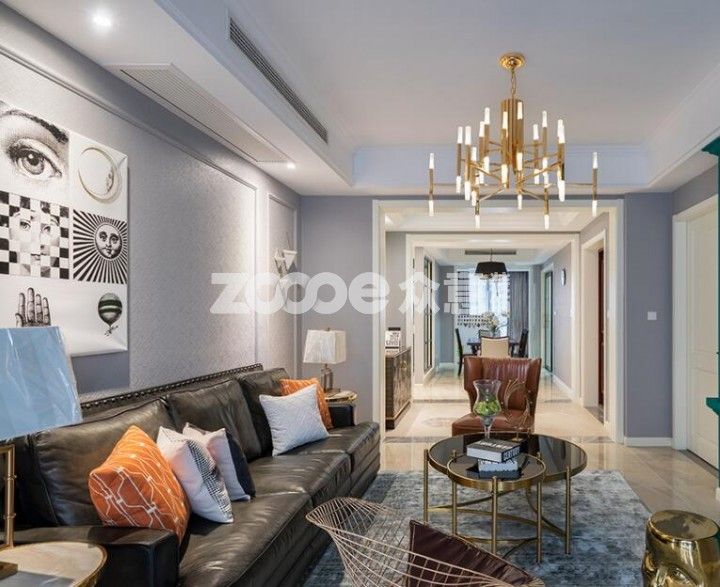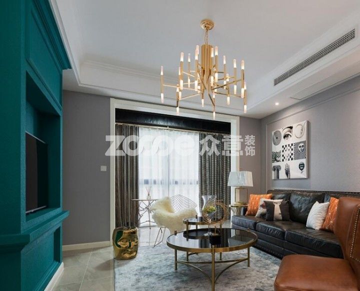 客廳永遠(yuǎn)是美式風(fēng)格的重頭戲,小美式也不例外,藍(lán)色和金色作為主打色,灰色和黑色作為輔助色。整個空間有主有次相輔相成。