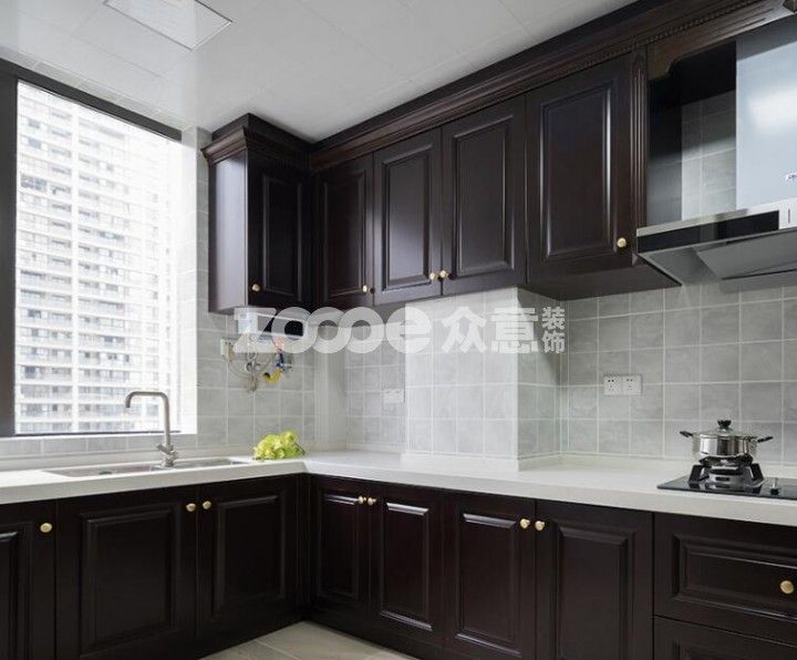 美式風(fēng)格偏愛用黑胡桃木,不僅因?yàn)槟静耐庑蚊烙^耐用,也因?yàn)樗軐⒚朗斤L(fēng)格的氣質(zhì)襯托的更上一層樓。這樣的廚房,不僅使用而且顏值高。