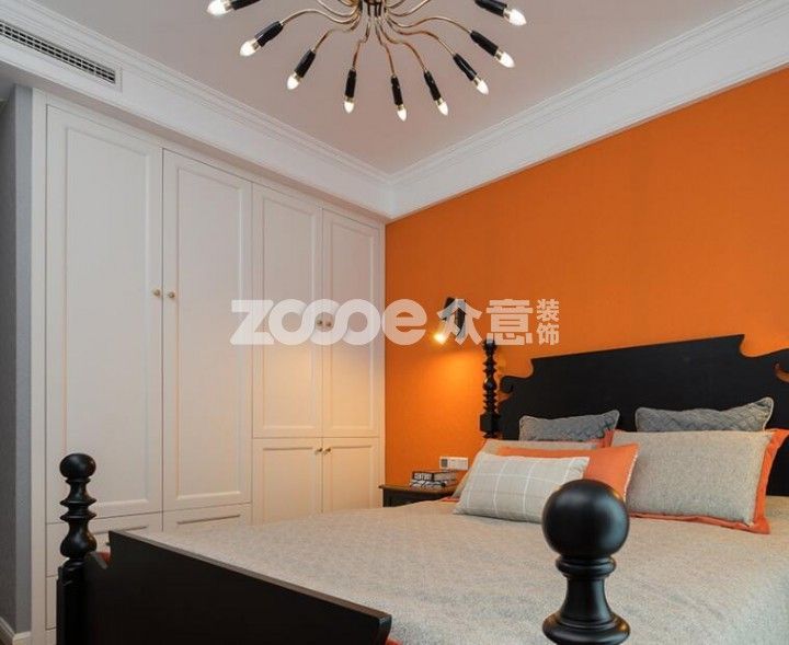 臥室床頭背景墻大膽采用橘色,將整個臥室從視覺感受上就暖融融的,即使是零下也覺得溫暖。