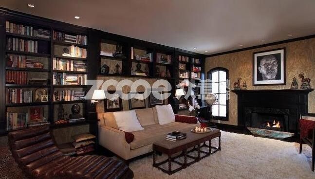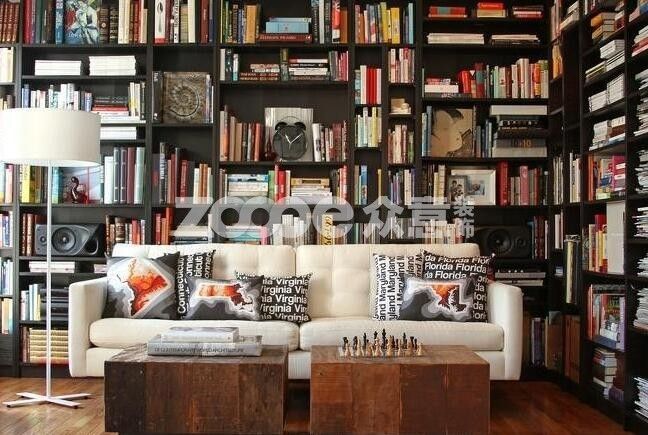 客廳空間夠大,整面墻全部用作書柜也是可以的,節(jié)省了書房空間。