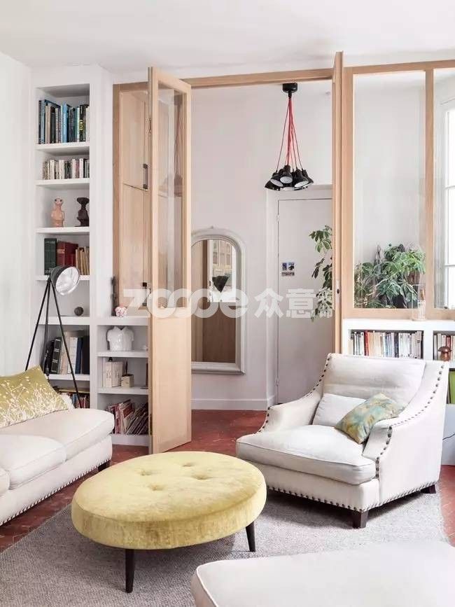 建筑還保留著原先的格局,設(shè)計(jì)師Camille Hermand 卻利用了更巧妙的方法將它分割,過(guò)道與客廳之間的隔墻被拆除了部分,重新利用定制的儲(chǔ)物架得到延伸,屋主的書籍、擺設(shè)都可以得到妥當(dāng)?shù)臄[放,室內(nèi)以純凈的白色調(diào)為基底,家具也采用線條圓滑、溫暖的米白色為主,營(yíng)造出優(yōu)雅柔和的基調(diào)。