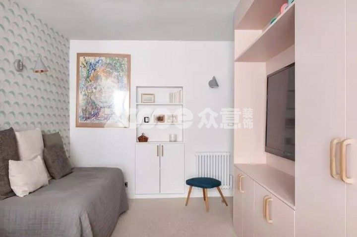 室內(nèi)的布局如同迷宮般有趣,多處“隱藏”的門,讓功能區(qū)的尋找也充滿了樂(lè)趣,通過(guò)架高的木質(zhì)樓梯,小巧的門框,便聯(lián)通到了臥室區(qū),白色基底下粉色的定制衣柜與地毯互相呼應(yīng),灰色調(diào)的單人床、壁紙、裝飾畫,色彩豐富卻十分的柔和,更增加了甜蜜與夢(mèng)幻感。