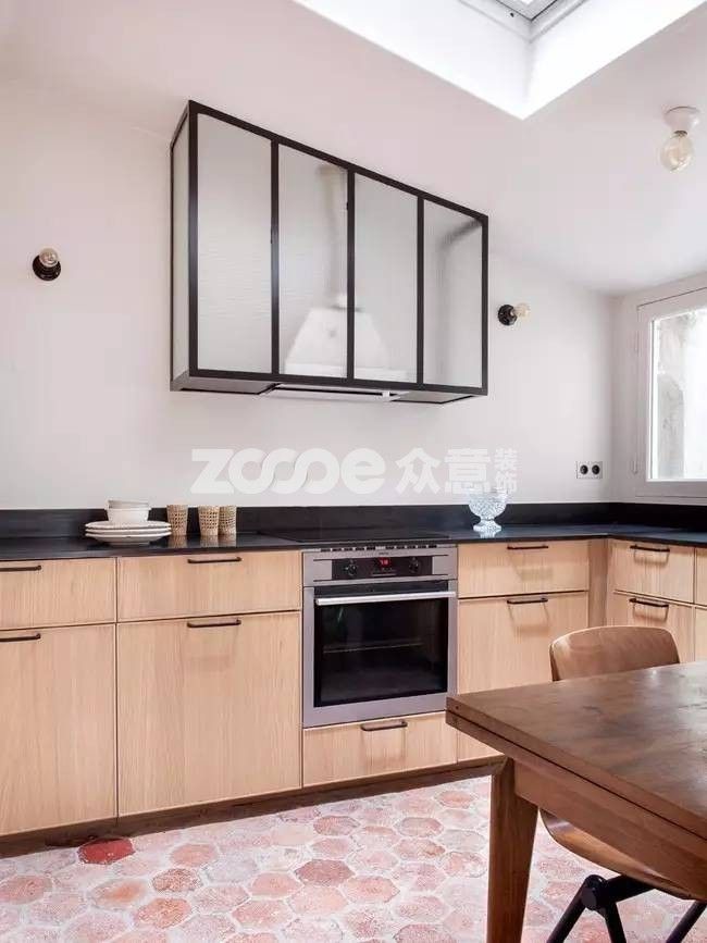在廚房的天花上,設(shè)計(jì)師特意開設(shè)了天窗,讓光線可以從四處灑進(jìn)室內(nèi),避免豐富的櫥柜以及黑色調(diào)大理石帶來(lái)的壓抑感。