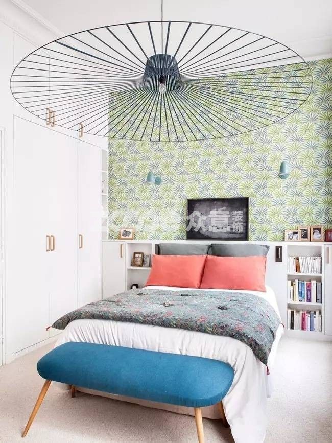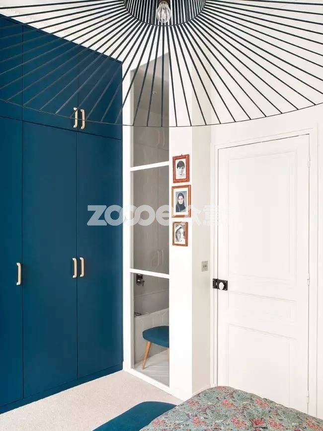 另一間臥室利用定制的柜體讓室內(nèi)擁有豐富的儲(chǔ)物空間,所有東西都收納妥當(dāng),帶來(lái)潔凈清爽的視覺(jué)效果,夸張的吊燈、紅色的點(diǎn)綴,藍(lán)色調(diào)的延伸從臥室至洗浴室,素雅的空間也擁有多處視覺(jué)焦點(diǎn)。