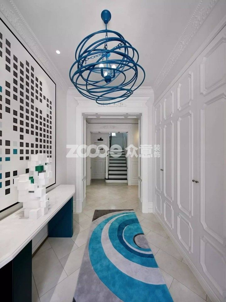 最吸引眾意小編的是玄關(guān)的這頂燈,藍色金屬串聯(lián)起來的線條,看似雜亂其實有跡可循,與地上呈放射狀圓弧形的藍色地毯,形成呼應(yīng)。