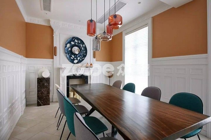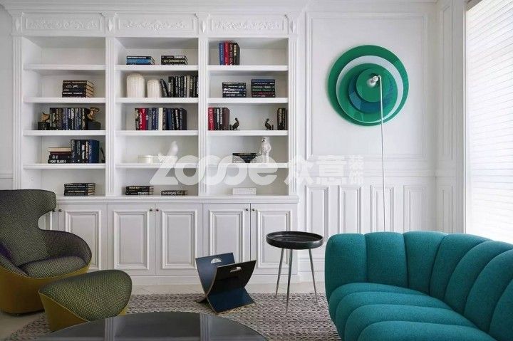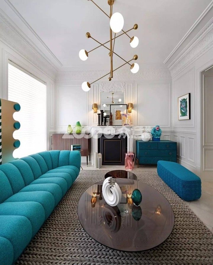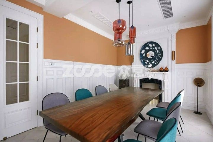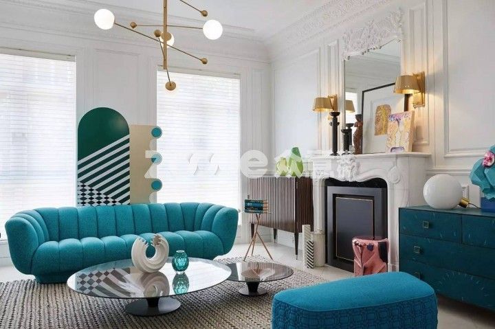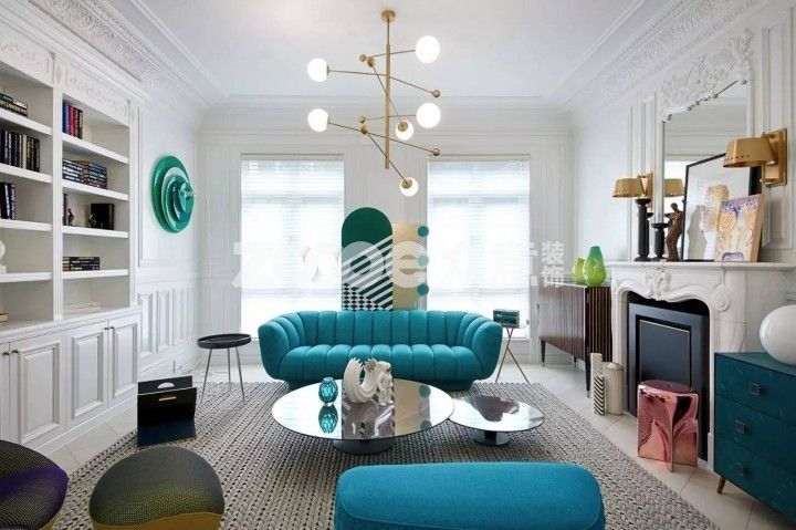 從來沒有哪個設(shè)計師會在一個空間里放這么多色彩,似乎曾經(jīng)保持不超過三色在這里被打破了。這樣的軟裝布局,華麗的石膏線——古典的裝修手法,搭配現(xiàn)代的家具——沙發(fā)背后的異形屏風(fēng),摩登又有趣。
