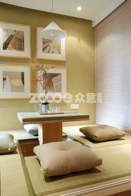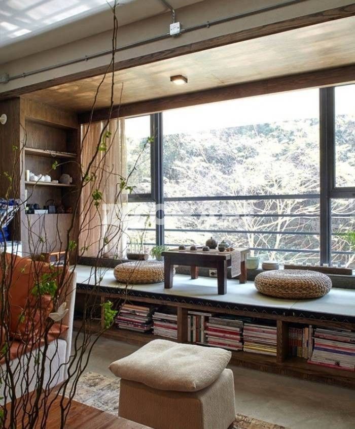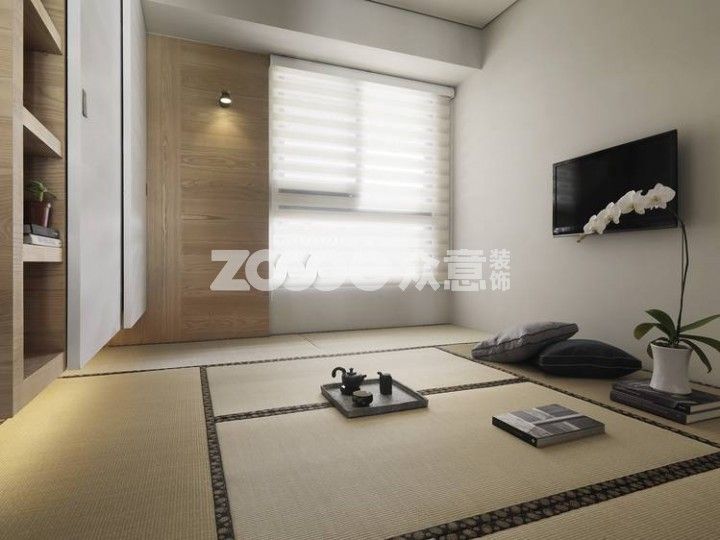 飄窗總是獨(dú)得大自然的恩賜,有陽光與微風(fēng)相伴。不用單獨(dú)再做地臺(tái),在這樣的一個(gè)位置,放置一張草席,兩三個(gè)蒲團(tuán),一個(gè)茶幾,就是一個(gè)榻榻米。
