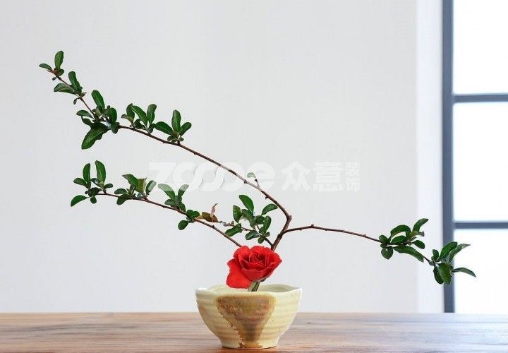 一個碗狀的米色陶瓷花盆,一根枝丫,一朵紅花,如果把它們作為熱戀小情侶或者新婚燕爾的房間插花裝飾,也可以為生活增添不少情調。