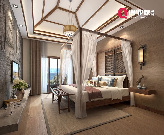 臥室的房屋結(jié)構(gòu)為頂躍,層高為港式風(fēng)格最理想高度,所以在頂面的處理上打破了常規(guī)用乳膠漆裝飾的手法,選擇用柚木飾面在頂面做了些異性的處理,采用這樣的手法,更加透露出港式風(fēng)格新穎的時尚感。