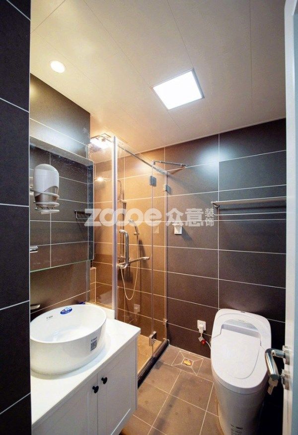 由于衛(wèi)生間是“濕區(qū)”,所以設(shè)計(jì)師就選用原木色的燈光作為淋浴房的照明,巧妙的將原木體現(xiàn)在這里,讓人不禁拍手稱嘆。