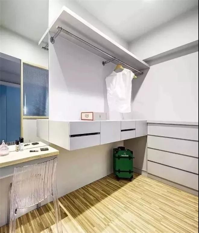 這是臥室的另一個房間,說是臥室,其實更應該稱這里為休閑區(qū),主要突出功能性和舒適性,左面全為柜體式墻面,打開里面空間容量大,輕松解決空間收納問題。