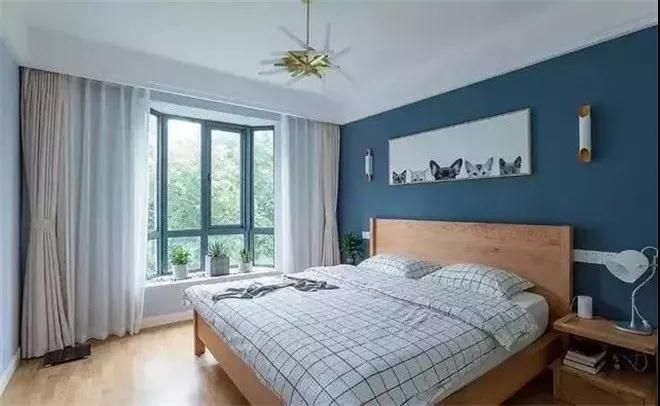 ▲主臥的設計讓人驚喜!大大的落地窗,門外就是美麗的風景,打開窗,就能呼吸到新鮮的空氣。深藍色的背景墻搭配原木臥床,淺色布藝,清新舒適。