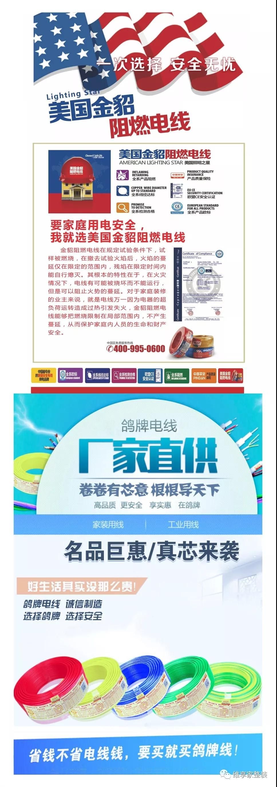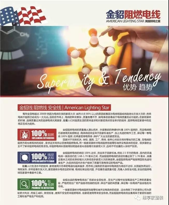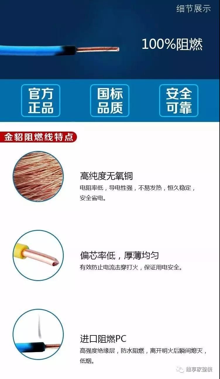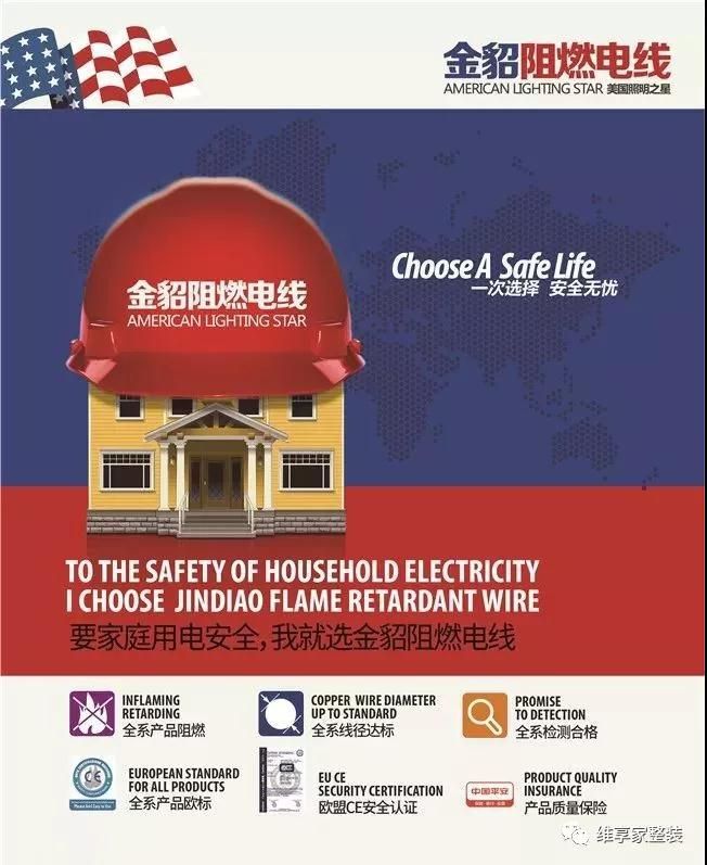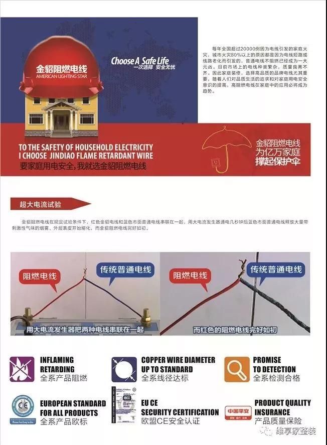 維享家選用安全系數(shù)更高的美國(guó)金貂阻燃電線(xiàn),選用特殊阻燃材料,能在發(fā)生火災(zāi)時(shí)阻止火勢(shì)的迅速蔓延,給你的家更安心的保障,就如它的宣傳標(biāo)語(yǔ)一樣“一次選擇,安全一生。”
