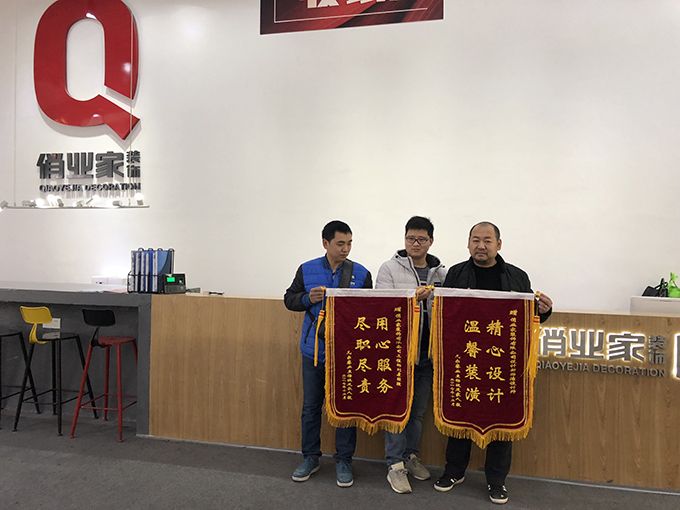 業(yè)主贈設(shè)計師楊潔嘉獎錦旗——“精心設(shè)計,溫馨裝潢”;業(yè)主贈項目經(jīng)理錦旗——“用心服務(wù),盡職盡責(zé)”。
