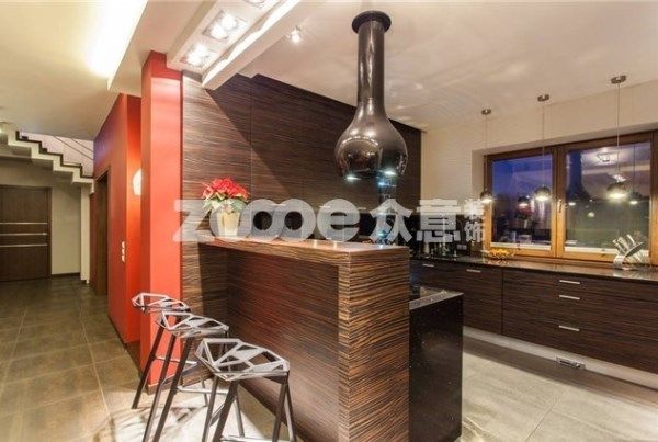 有些開放式餐廳也與客廳相連,做一個(gè)造型簡(jiǎn)單大方的吧臺(tái)隔斷,或放置一個(gè)酒柜,也不失為一種經(jīng)濟(jì)實(shí)用的設(shè)計(jì)。