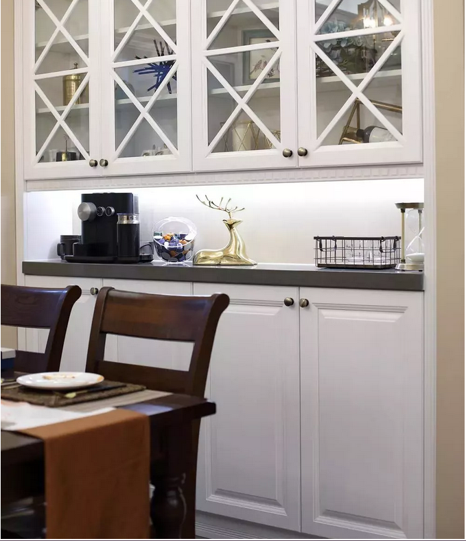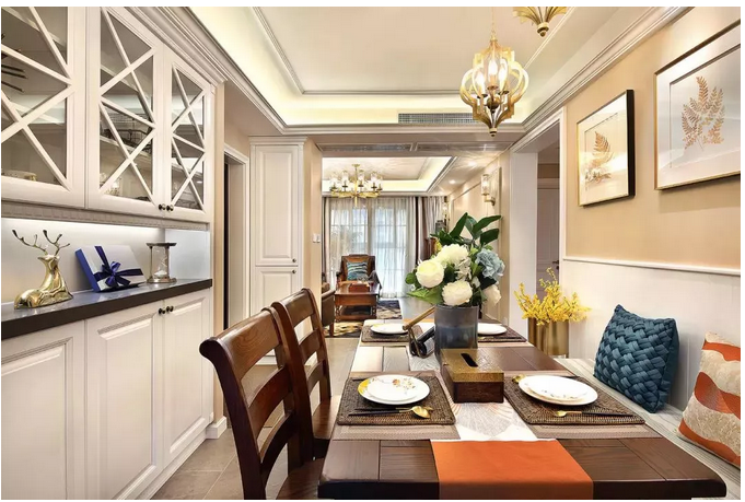 餐廳的一側(cè)定制的白色餐邊柜,里面擺滿了主人收納的裝飾品,每一個(gè)裝飾品都透漏著業(yè)主精致的生活。