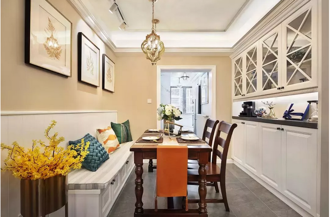 餐廳摒棄傳統(tǒng)的餐桌椅,有效利用空間,以定制為主做了卡座式的餐桌椅,美觀又實(shí)用下面又可以作為收納空間儲(chǔ)藏。深色穩(wěn)重的餐桌椅搭配精致的吊燈,混搭簡(jiǎn)約大氣的軌道燈作輔助光源,讓掛畫也有了時(shí)尚的展示。