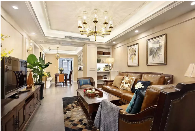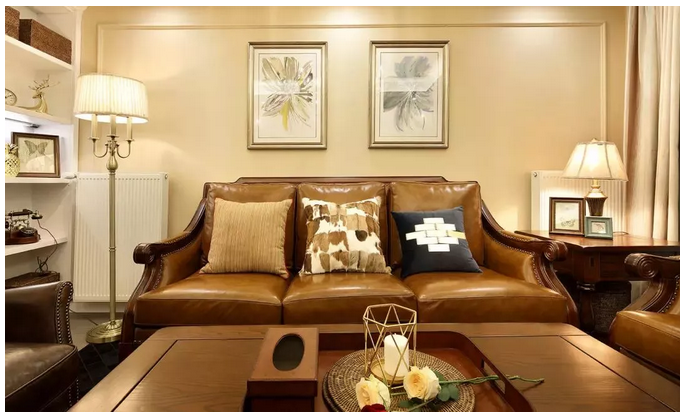 沙發(fā)選用3人座的棕色皮質(zhì)沙發(fā),方便打理,同時(shí)透露著高貴的氣質(zhì)。沙發(fā)背景墻用兩張清新的掛畫點(diǎn)綴,透漏出來的高雅品質(zhì)生活。