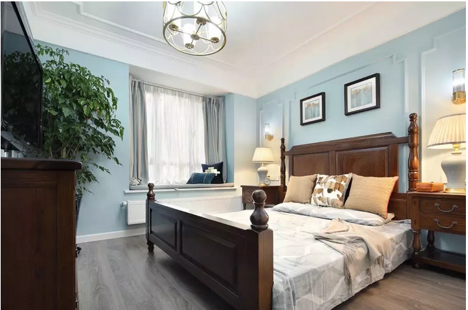 主臥墻面采用淺藍(lán)色乳膠漆搭配白色吊燈,床選購深色系的材質(zhì)搭配淺色系的床品,藝術(shù)的精致吊燈,墻角綠色植被給整個(gè)空間給來不一樣的生氣,飄窗以休閑為主,整體搭配營造出一種不一樣的品質(zhì)睡眠環(huán)境。
