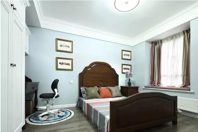 次臥作為兒童房,墻面也是采用和主臥一樣的淺藍(lán)色乳膠漆,搭配深色床,在定制的衣柜一側(cè)靠近墻面角落留出鋼琴的空間。床頭背景選用的裝飾畫是孩子喜歡的不同款式的汽車哦。