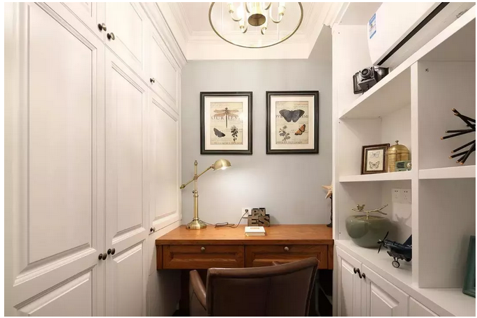 書房兼具衣帽間,定制的裝飾柜同樣擺滿了業(yè)主收藏的裝飾品。精致的吊燈和臺(tái)燈,柜子線條感也是干凈利落。雖然空間比較小視覺上還是比較寬敞明亮。