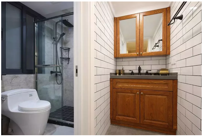 衛(wèi)生間干區(qū)臺(tái)盆柜定制深色系,上面的鏡柜里面隱藏著女主人平時(shí)的洗漱用品哦,墻面大面積的采用白色方型磚,干凈清爽明亮。