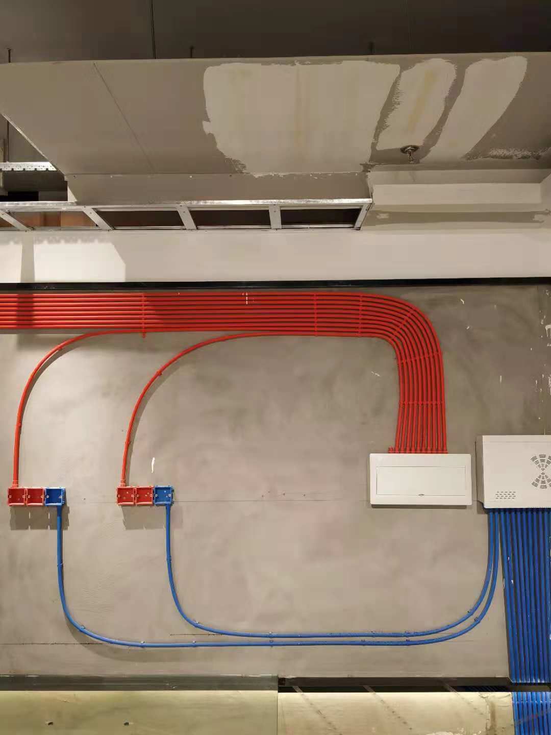 電路規(guī)劃過(guò)程中,紅色線管為強(qiáng)電線管走天,藍(lán)色線管為弱電線管走地,排列講究大灣工藝,這樣做既美觀也有效避免強(qiáng)弱電干擾,也方便后期對(duì)電線的定位