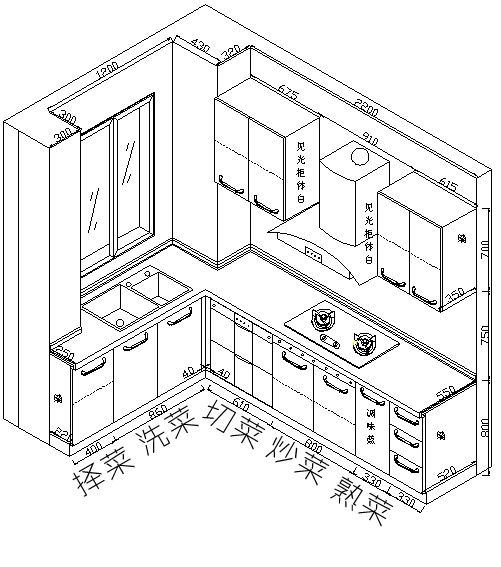 尺寸規(guī)劃 分區(qū)所需尺寸參考 水槽區(qū):800mm; 切菜區(qū):600mm; 爐灶區(qū):900mm; 柜立柱:25mm/根; 其他區(qū):400mm; 臺(tái)面深度:520mm~650mm; 吊柜深度:320~350mm。 廚房有效長(zhǎng)度至少2400mm能正常使用 如果家里煮飯的人不固定,可以統(tǒng)一臺(tái)面高度800mm,可能會(huì)產(chǎn)生下面的不足。