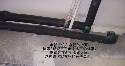 水電管交叉時(shí)怎么處理? 如果水管在上,當(dāng)出現(xiàn)冷凝水,可能使電線受潮,出現(xiàn)短路、跳閘的情況(雖然概率非常低),所以建議水管在下。 走天的水電可以直接分層走線,電在上。 走地可以切開水管,安裝一個(gè)過橋彎繞下方,將電線靠在水管的上方。