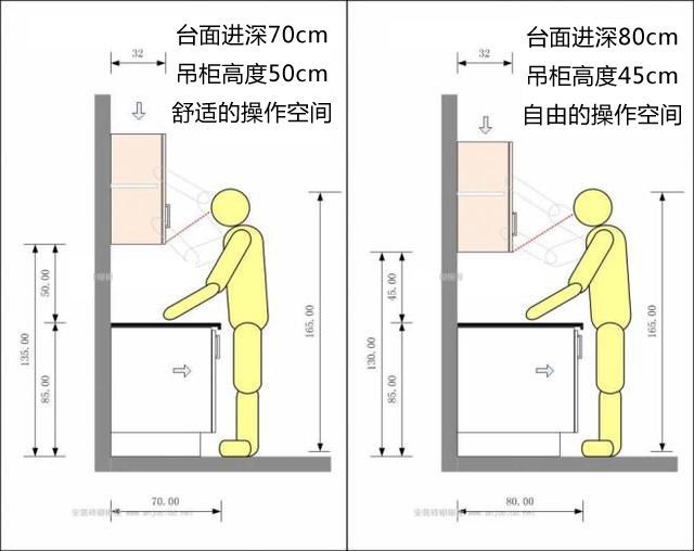 改善方案 臺(tái)面高度:炒菜臺(tái)面一般750mm舒適,洗切菜臺(tái)面一般875mm感覺舒適。