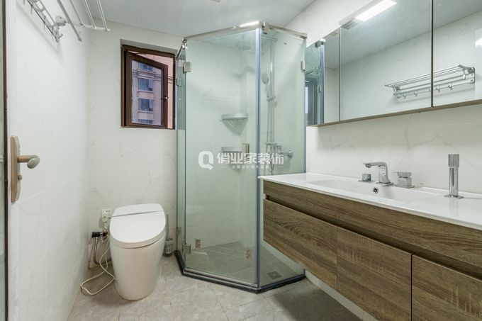 3、如果你是白色控,不妨布置一個(gè)這樣的浴室。白色能增強(qiáng)空間的通透性,對(duì)于空間比較的小浴室來說也是也是一種擴(kuò)容的妙招。如果你的浴室空間較小,不妨采用這樣的擺放方式吧。深色調(diào)的浴室柜為浴室增添更多穩(wěn)重的氣息,多層置物架也能滿足你不同的置物需求。