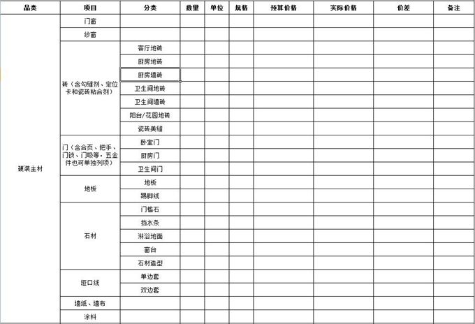 首先確定哪些裝修材料是你需要購買的,越詳細越好,盡量涵蓋所有家裝材料項目分類。比如以下項目。