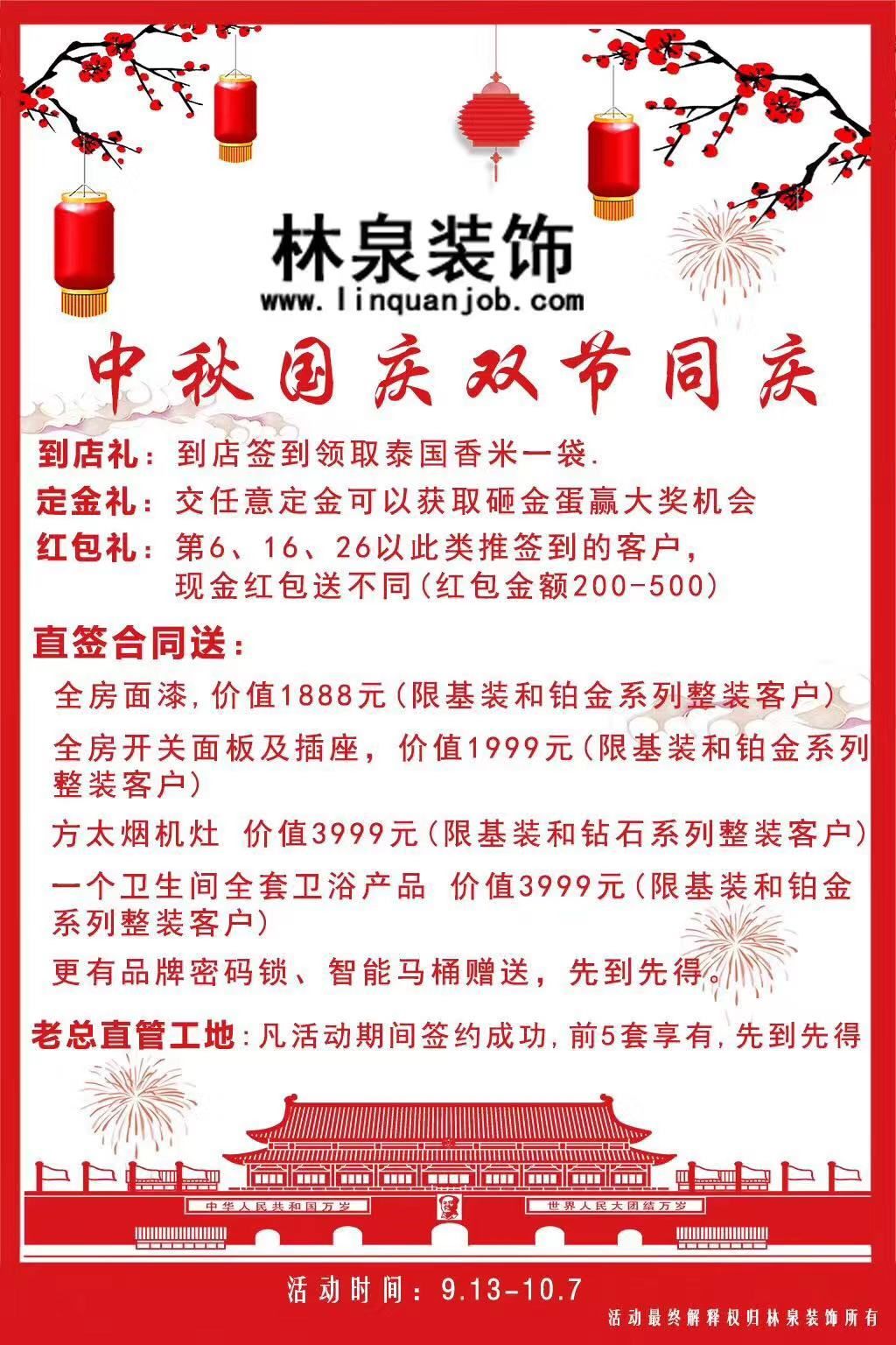 您的位置:首頁 >> 裝修新聞 >>  林泉裝飾  >> 迎中秋—慶國(guó)慶鉅惠大酬賓