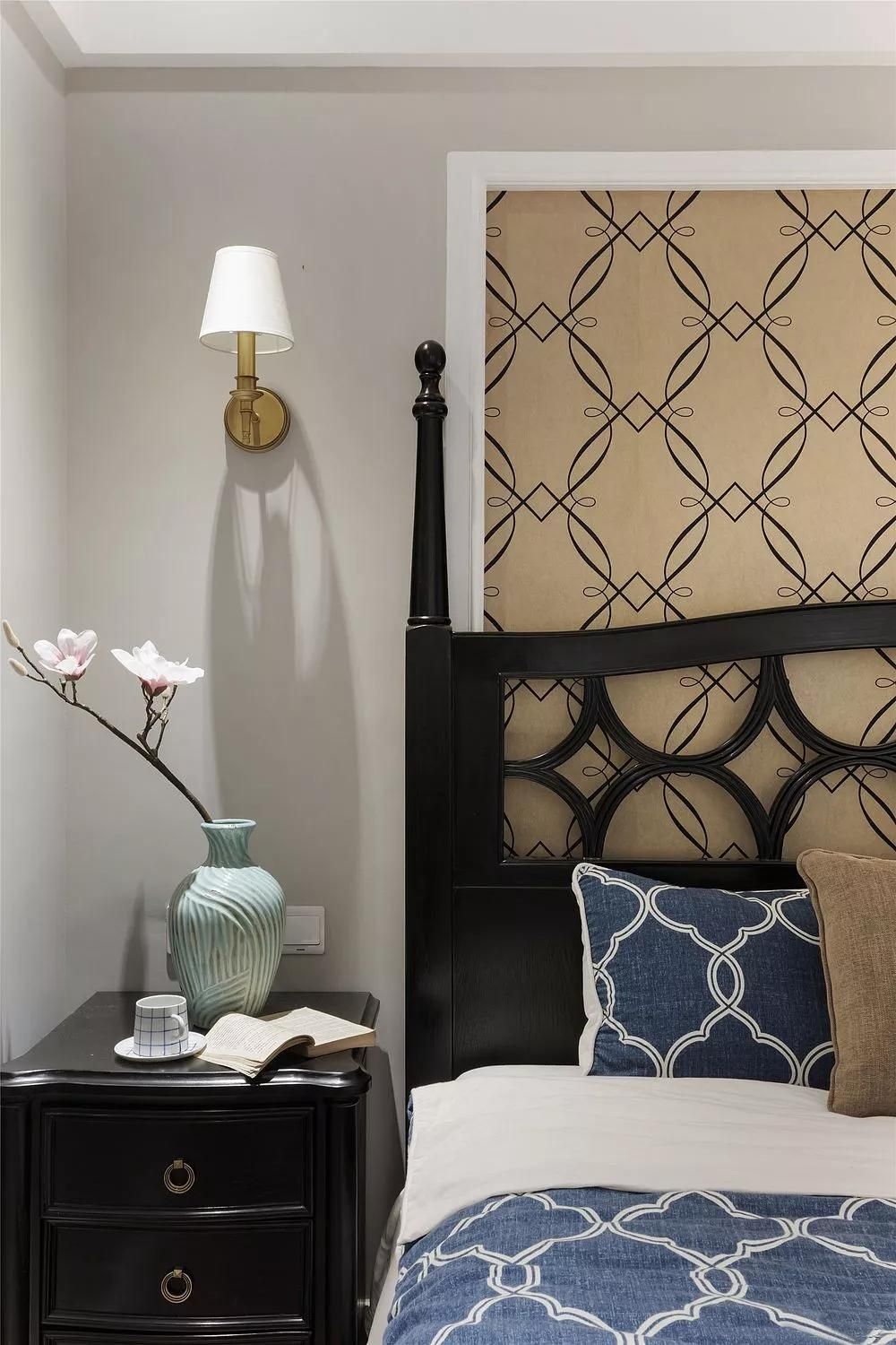 鏤空的床頭設(shè)計(jì)展現(xiàn)獨(dú)有的韻味,和背景墻紙相映成趣。 床頭兩側(cè)的木質(zhì)床頭柜擺上清新的花束與小擺件,帶來(lái)一份恬淡安逸的氣息。