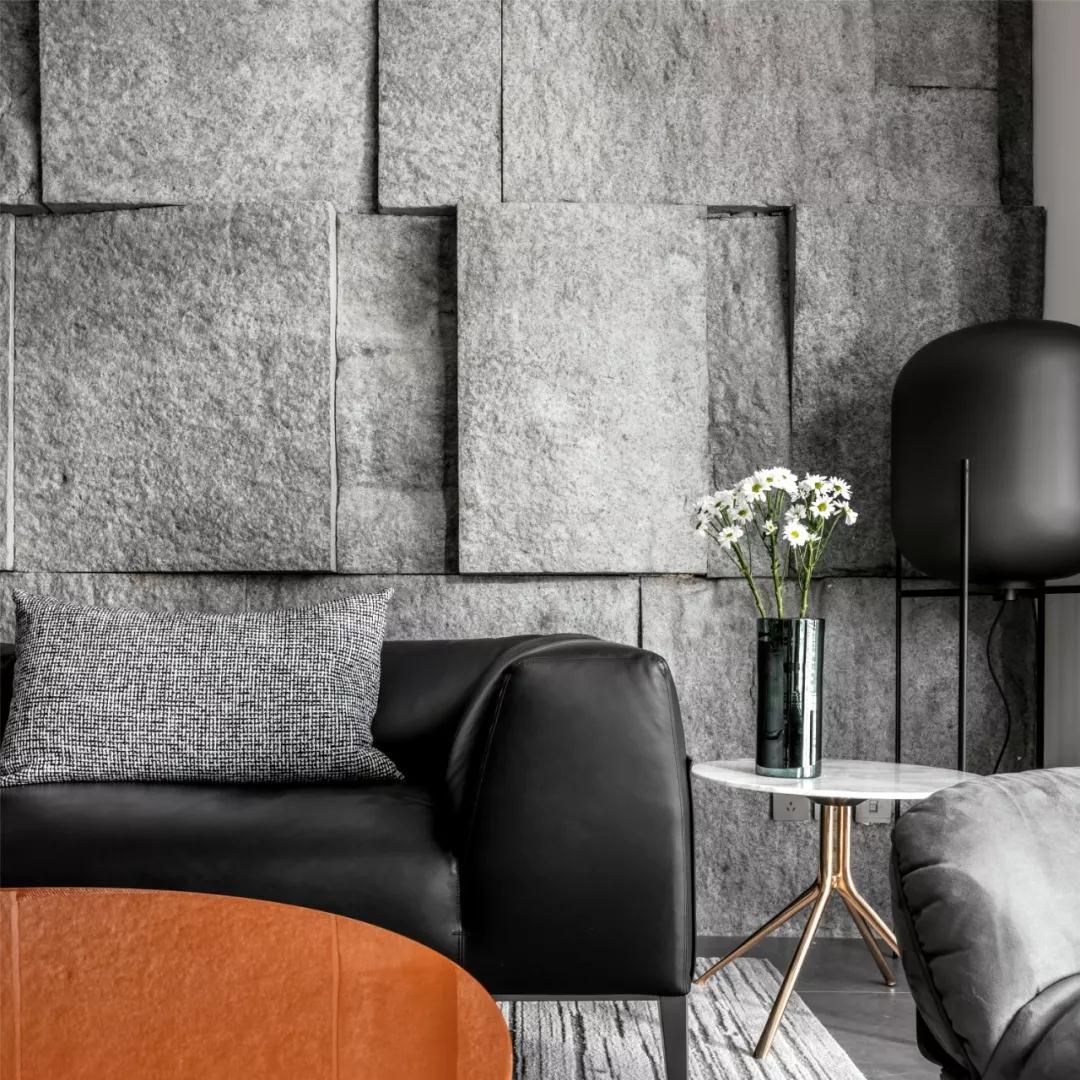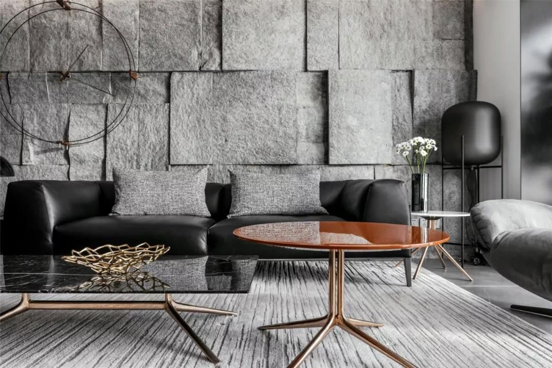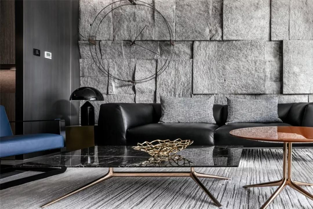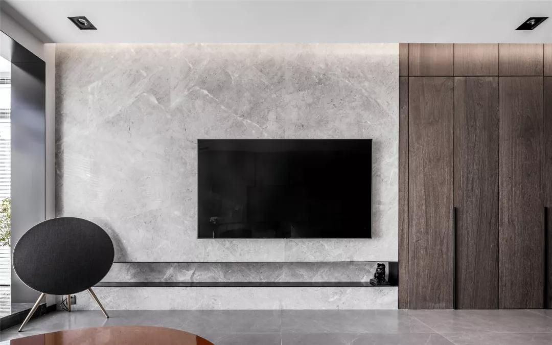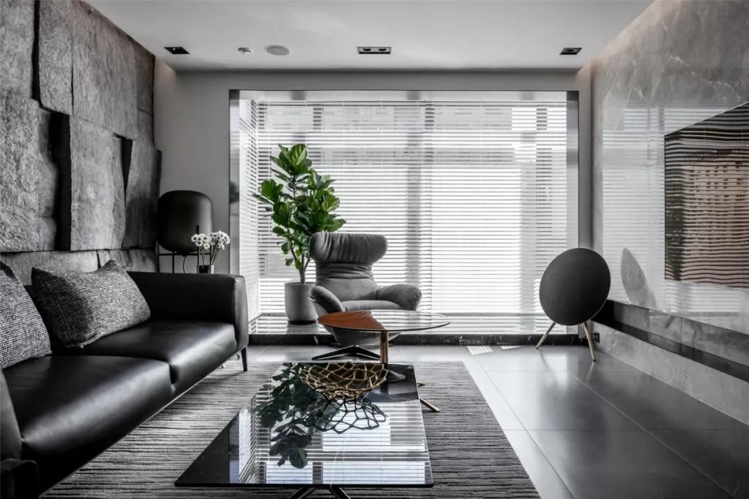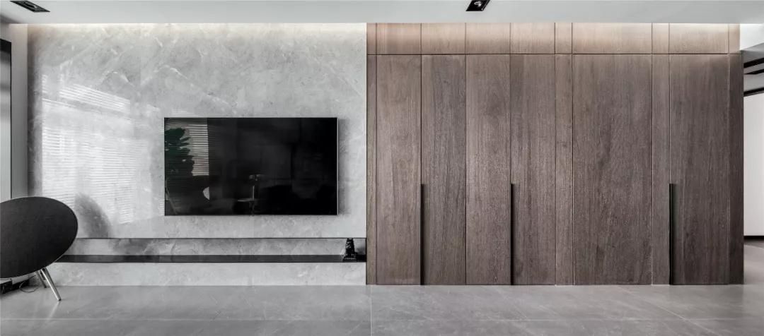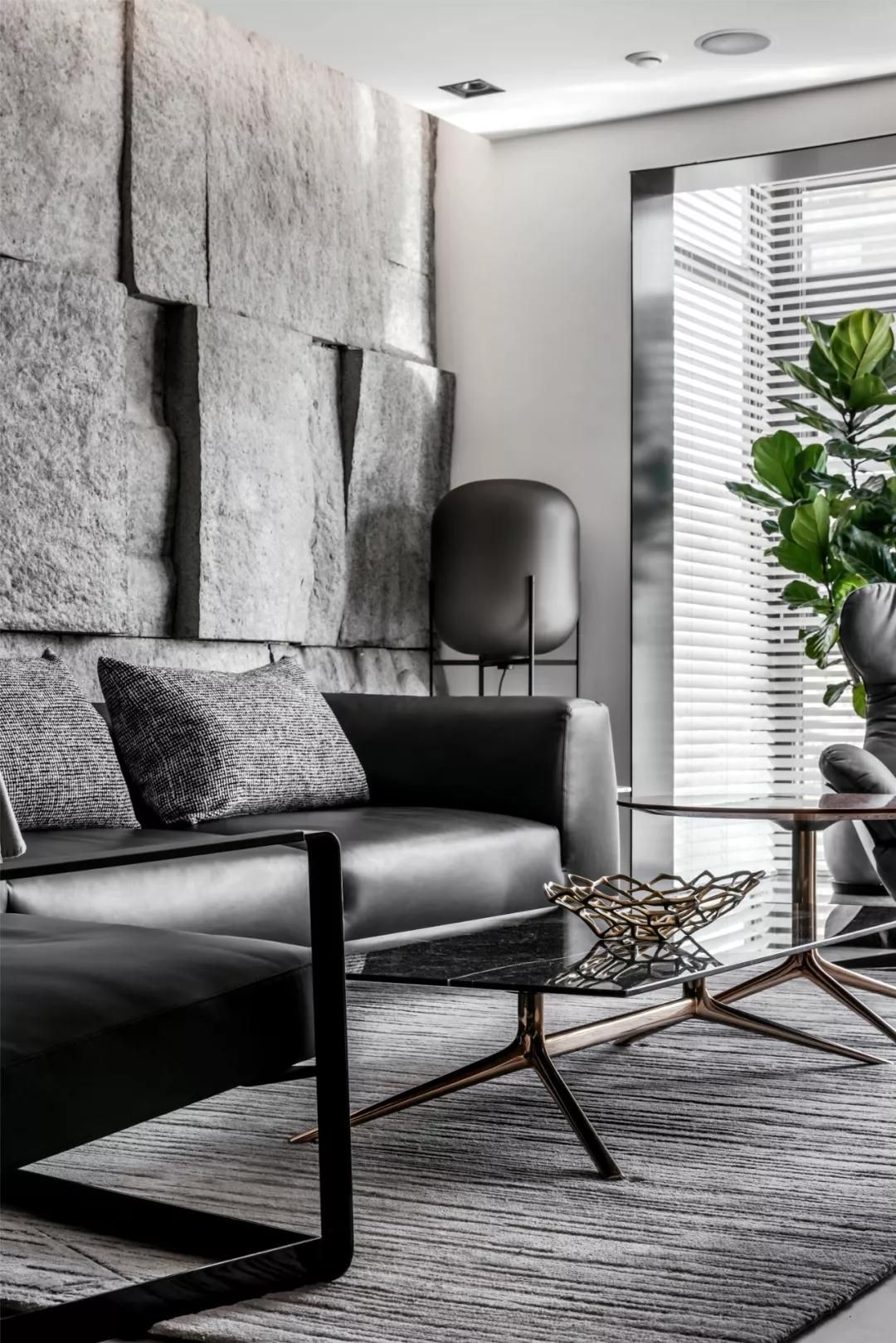客廳呈黑白灰色調(diào),作為整個客廳的亮點 - 沙發(fā)背景墻,設計師用特殊材料做呈現(xiàn),還原并強調(diào)空間內(nèi)材質(zhì)交織的魅力,引入質(zhì)樸天然的石材,與良好的自然光照相映,平衡著整個空間內(nèi)的家具造型,同時也平衡著理性的生活方式,并滿足感性,大膽,創(chuàng)新的生活體驗。極簡風格的電視背景墻與木紋,石材形成了獨有的成熟內(nèi)斂氣質(zhì)。